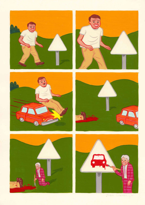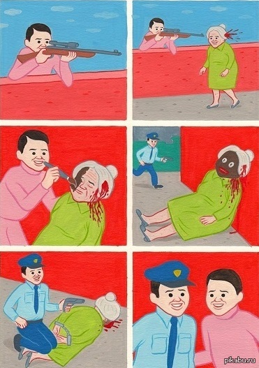 모든 그림에서 피가 난자하나 캐릭터들이 웃음을 짓는 것으로 보아 사회비판적 메세지가 강하게 들어있는 것 같아 저도 좀 강하게 해석하긴 했습니다
